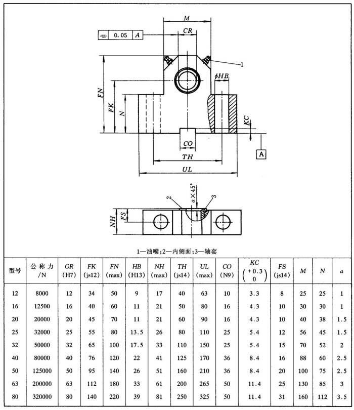 释义 | 安装连接元件 (1)安装连接方式 据国家标准GB9094-88和国际标准ISO6099- 1985规定了液压缸的53种安装型式。在实际使用中较广泛采用的安装连接方式见表23.3-14。 表23.3-14 液压缸常用的安装连接方式 (α)单耳环式(不带轴套);(b)单耳环式(带轴套);(c)单耳环式(带球铰轴套);(d)单耳环式(带关节轴承);(e)双耳环式 ·单耳环式(不带轴套,如图23.3-40a):耳环的销孔一般用H8~H9配合。 ·单耳环式(带轴套,如图23.3-40b):轴套为圆柱体,材料为青铜、镀青铜双金属钢带或高强度塑料。耳环的销孔一般用H11配合。 ·单耳环式(带球铰轴套,如图23.3-40c):球铰轴套由套座和轴套组成,轴套外圆是球面,一般能作±3°~10°的摆动,球面用m6配合,球面淬硬到HRC50。耳环的销孔一般用H5~H7配合。 ·单耳环式(带关节轴承,如图23.3-40d):关节轴承为标准件,一般能作±4°~8°的摆动,耳环的销孔一般用H7配合。 ·双耳环式(如图23.3-40e):耳环的销孔一般用H7~H9配合。 B.耳环的尺寸计算 耳环的结构尺寸如图23.3-41所示(图为缸筒用耳环尺寸示意图,杆用耳环借用此图)。 (a)单耳环(不带轴套);(b)单耳环(带轴套);(c)单耳环(带球铰轴套);(d)双耳环 耳环的销孔支承压力的计算 高负载轴套可用薄轴瓦,即用镀青铜双金属钢带,有渐开形开口,装入耳环轴孔后用薄楔片嵌入开口处使钢带外圆紧贴轴孔(图23.3-43)。 低负载轴套可用塑料制造,其优点是:能补偿销轴与轴套对中不良的缺点,能无油工作,摩擦系数较低:f≈0.1(有润滑),f=0.15~0.2(无润滑)。尼龙66的许用压应力pb0=5MPa,用玻璃纤维增强的尼龙11的许用压应pb0=12.5MPa。轴套与销轴的工作间隙一般为(0.005~0.007)d。受潮后,尼龙制的轴套会膨胀以致间隙减小。 (3)耳环用柱销 耳环用的柱销的型式和尺寸代号见图23.3-44、表23.3-15单耳环用柱销尺寸系列(ISO/DIS8133)、表23.3-16单耳环(带球铰轴套)用柱销尺寸系列(ISO/DIS8134)和表23.3-17双耳环用柱销尺寸系列(ISO8132)。 (a)柱销(用开口销);(b)柱销(用弹簧圈) 表23.3-15 单耳环用柱销尺寸系列(ISO/DIS8133) |