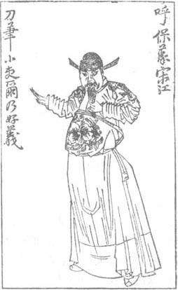 北宋末年农民起义领袖,山东郓城人,史载:“以三十六人横行河朔,转掠十郡,官军莫敢撄其锋。”在《水浒传》中,宋江被塑造成为逼上梁山,共聚大义,“替天行道”的农民起义英雄形象,是救人危难的“及时雨”,好施乐助的“呼保义”。在《金瓶梅》中,他同淮西王庆、河北田虎、江南方腊并称为搅乱社会的“四大寇”,所不同的是:“惟有宋江,替天行道,专报不平,杀天下赃官污吏、豪恶刁民。”书中第八十四回,宋江在清风寨向燕顺、王英、郑天寿说情,救助了被劫上山、强逼成亲的西门庆遗孀吴月娘,表现了宋江的仁义心肠。