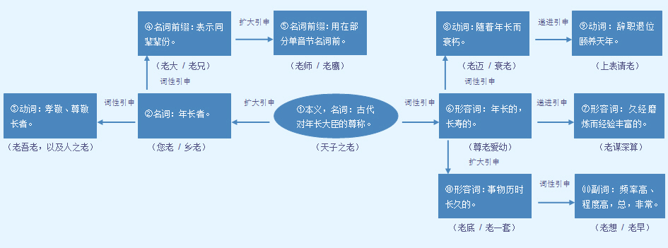 释义 | ![]() ❶ 年岁大: ~人|~大爷|~马识途|年纪轻轻就一副~相|这位大爷六十多岁了,一点也不显~。 少 shào ~年|~女|~壮|现在我还常常想起年~时的事。 幼 yòu ~儿|~虫|~苗|年~无知。 ❷ 老年人: 敬~爱幼|扶~携幼|~有所为|老吾~,以及人之~。 少 shào 遗~|老~皆宜。 幼 yòu ~教|~师|扶老携~|加强妇~保健。 ❸ 很久以前就存在的;时间久的: ~厂|~朋友|~交情|~牌子|别看她年轻,她可是公司的~员工了。 新 xīn ~设备|她家刚买了一套~房子|这里所有的东西都是~的|这是刚刚开始实施的~规定。 ❹ 陈旧的;过时的: ~思想|~脑筋|这种款式太~了|那件衣服式样很~。 新 xīn ~眼光|~观念|推陈出~|我们应该接受~思想,采用~办法。 ❺ 在某些方面富于经验的: ~练|~于世故|~谋深算|下棋方面,他可是~手了。 新 xīn 他还是个~手,需要多训练|这个歌星还是个刚出道的~人。 嫩 nèn 跟他斗,你还~了点|这方面你太~了,经验不够。 ❻ 不柔嫩: 黄瓜长~了|他早已满手~皮。 嫩 nèn 春天树木抽出了~芽|这孩子的皮肤真~啊。 ❼ (煮食物)过了火候: 鸡蛋煮~了|青菜别炒得太~|那盘肉片烧~了。 嫩 nèn 这笋火候刚好,炒得很~。 ❽ 颜色深: ~蓝|~红|~绿。 嫩 nèn ~绿|今天她穿了一件~黄色毛衣。 ❶年岁大。可受程度副词修饰。 a.常作带补谓语。 几年不见,你~多了|已经~得不行了|妈妈这两年好像~得特别快|那和尚已经很~了|人~了,不想动了。 b.作定语。 ~同志|革命的~妈妈。 c.作宾语。 他不服~|60岁并不算~嘛! ❷久远的;原来的。常作定语。 ~地方|~上级|~朋友|~地名|~脾气。 ❸蔬菜等长过了头,不宜吃;火候大。可受程度副词修饰。 a.常作谓语,可带补语。 笋子太~了,不好吃|油菜薹儿一点不~|这豆腐太~了一点。 b.作补语。 南瓜还没长~,一点儿不甜|鸡蛋煮~了|糖熬~了,有点苦味儿。 老年人(常用作尊称)。常用于固定词组中或用作语素构成合成词。 扶~携幼|董~|敬~院。 多指老人死亡。必带“了”,婉辞。 王家~了人了。 ❶很久;经常。仅作状语。 ~不见你来,我都等急了|小华~想着比赛的事儿|别~站着呀|他~迟到。 ❷很;极。作状语。 他~爱开玩笑|太阳已经~高~高了。 常用在人或动物的名词前、单音姓氏前或2到10的数字前构成名词。 ~百姓|~虎|~鹰|~王|~李|~大|~三|~幺。 【辨】 老和总:见“总”。 【近】 〈形〉❶大 ❷旧 〈副〉❶久 总 ❷很 极 【反】 〈形〉❶少 小 幼 ❷新 ❸嫩 【词语】 老百姓 老板 老伴 老本 老巢 老成 老粗 老搭档 老大 老大难 老当益壮 老到 老底 老调 老掉牙 老夫子 老古董 老好人 老狐狸 老话 老化 老家 老奸巨猾 老谋深算 老牛舐犊 老牌 老气 老前辈 老弱残兵 老少 老生常谈 老手 老态龙钟 老顽固 老小 老羞成怒 老朽 老一套 老油条 老远 老账 老者 老子 字源解说 老,甲骨文 ![]() ![]() ![]() ![]() ![]() ![]() ![]() ![]() ![]() ![]() ![]() ![]() ![]() ![]() ![]() ![]() ![]() 附 文言版《説文解字》:老,考也。七十曰老。从人毛匕。言須髮變白也。凡老之屬皆从老。 附 白话版《说文解字》:老,衰朽。人到七十的状态叫“老”。采用“人、毛、匕”会义。这是说须发都变白了。所有与老相关的字,都采用“老”作边旁。 引申线索 ![]() 【字族索引】 耂 老 【同音字】 lǎo |