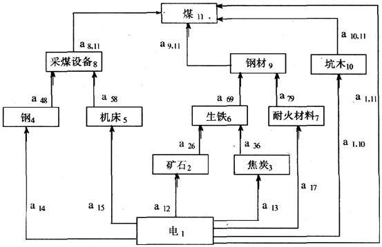 为直接消耗系数加上所有间接消耗系数的总和。 所谓间接消耗系数可用采煤需直接和间接消耗电力来予以说明(如下图)。图中列了11种产品,每两种产品之间的直接消耗系数均已标在图上,如a36表示生铁生产直接消耗焦炭,a13表示生产焦炭要直接消耗电力。 那么生铁生产对电力的消耗则称为一次间接消耗,表示为a36与a13的乘积a36a13。同理钢材生产对电力的二次间接消耗为a69a36a13或a69a26a12。依此类推还有三次、四次等间接消耗等等。采煤对电力的完全消耗系数是直接消耗系数a1,11加上全部的间接消耗系数。 可以证明,完全消耗系数矩阵B与直接消耗系数矩阵A有如下关系:B=(I-A)-1-I,也就是可由A求出B。