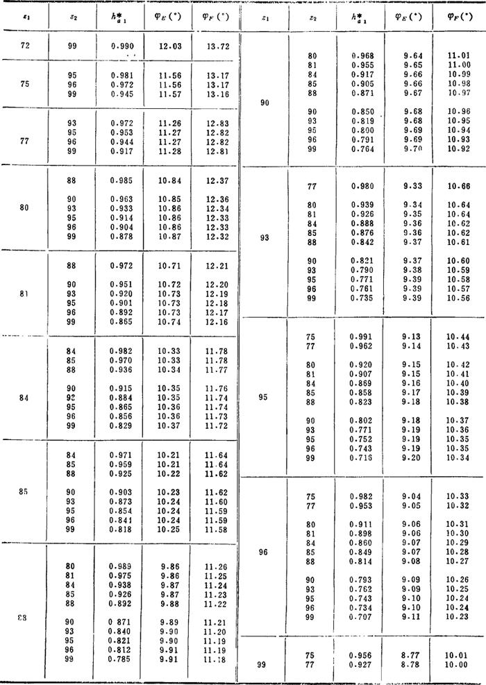 释义 | 完全齿数的可行域 依照式(5.11-9)、(5.11-11)的限制条件(以下简称条件1、条件2),用数值解可求得在一定K值下z1、z2的可取值,绘制成不完全齿轮机构主从动轮完全齿数的可行域,如图5.11-5所示,以供设计时初选和确定K、z1和z2值。图中,左上斜线区的齿数一般不取❶ ,因K≥2时该区不满足条件1。K=2与K=3之间的斜线区的齿数一般也不取❶ ,因K=2时不满足条件2,K=3时不满足条件1。K=3与K=4两区域有重叠的部分,即存在K=3或4均可行的区域,也存在K=2或3均可行和K=4或5均可行的区域。在同一K值区域内, 说明;(1)当z1、z2搭配在K=2区域左上界线以外附近的斜线部分时,按式5.11-8算得的 注❶ 详见图下说明。 表5.11-1 k=2 首末齿齿顶高系数 |