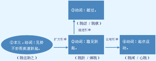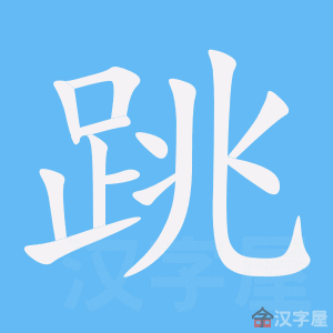 字源解说 兆,既是声旁也是形旁,表示预见、预示。跳,篆文 = (足)+ (“涌”,向上冒),造字本义:见势不妙而疾速跃起。 附 文言版《説文解字》:跳,蹶也。从足,兆聲。一曰躍也。 附 白话版《说文解字》:跳,蹶起。字形采用“足”作边旁,采用“兆”作声旁。另一种说法认为,“跳”是跃过。 引申线索