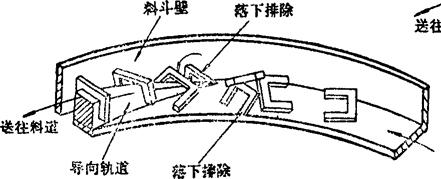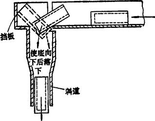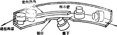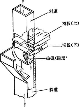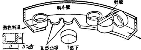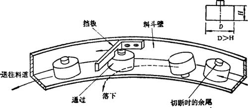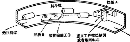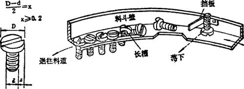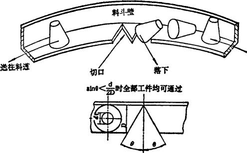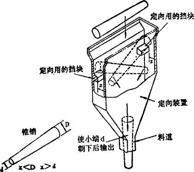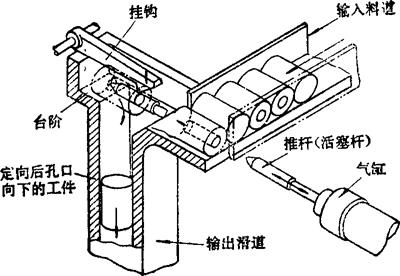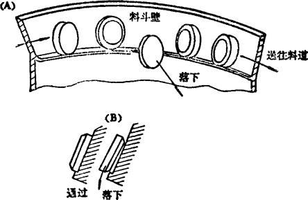释义 | 定向装置示例 工件的定向,有的在料斗滑道上进行(参见例5.14-13~5.14-22),有的在料斗外定向(参见例5.14-23~5.14-26)。 例5.14-13带倒角圆柱形工件的定向。有些圆柱形工件,常利用倒角进行定向。其倒角越大,则定向效果越好。如图示,在滑道上设置挡板A,使直立的工件倒下;挡板B与料斗内壁间隔一段距离,只允许倒角在前的工件通过,而将反向的工件推出滑道,落回料斗。 例5.14-14 圆锥形工件的定向。如图示,滑道上开有V形切口,当圆锥的大端在下时,工件可以顺利通过;工件小端在下或倒放时,将不被托住而落入料斗。若轨道宽为D,切口的半角为θ,圆锥小端直径为d,则:2Dsinθ<d时,各种姿态的工件都能通过;2Dsinθ=d时,小端向下的工件也可能通过;2Dsinθ>d时,只有大端在下的工件能够通过,完成定向。 例5.14-15 杯形工件的定向。如图示,在滑道上设有R形突缘。当已通过挡板倒下的工件,实底部在下时可以顺利通过;开口部在下时,开口与突缘形状吻合,工件落回料斗。为提高定向精度,也可设置多个突缘。 例5.14-16 垫圈类薄形工件的定向。如图示,这类工件可以利用其倒角或圆弧R的差别,以区分正反面而定向。在滑道上有一段宽度小于工件的倒角或圆弧R,因而只允许非倒角面贴住料斗内壁的工件通过。反向的工件则落入料斗。 例5.14-17 螺钉类工件定向。如图示,在滑道上开出一比钉体稍宽的长槽。倒放的工件通过挡板后,由于重力的作用,工件会自动地在长槽处呈吊挂状态定向。这种装置适用于x≥0.2的螺钉类工件。 例5.14-18 带小头短圆柱工件的定向。如图示,在滑道上设置有缺口的挡板,缺口的形状和工件小头形状相适应。这样,只有小头向上的工件才能通过,其它状态的工件则被挡住而落入料斗。这种装置的使用条件是D>H。 例5.14-19 带台阶短圆柱工件的定向。如图示,在滑道内侧开有切口,外侧设置定向挡块。切口的大小和挡块的尺寸要与工件的尺寸相适应,从而可使小端在下的工件顺利通过,而大端在下的工件碰到定向挡块后,由切口处落回料斗。 例5.14-20 U形工件的定向。如图示,在滑道上顺工件前进方向设置导向轨道,使工件前进时,呈骑马状态排列在导向轨道上,送往料道。其它方向的工件则落回料斗。 例5.14-21 利用落料孔定向。如图示,在滑道上开有与工件形状相适应的落料孔,在工件前进通过落料孔时,使形状和孔口方向一致的工件从落料孔掉回料斗;反之,两者方向不一致,则工件顺利通过,完成定向。 例5.14-22 利用气阻定向。如图示,在料道上顺工件前进方向设置上下斜坡,侧壁开有小孔,并装有喷嘴,连续喷气。由于带底和不带底两端面受到的气阻不同,因而只有底部在后的工件通过,底部在前的工件则被吹落料斗。 喷嘴中的气体压力和流量,应根据工件的重量和形状进行调节。 例5.14-23 锥形工件的定向。如图示,在定向装置顶部工件入口处两侧,装有定位用的挡块。挡块挡住锥形工件的大端,允许小端通过,从而使工件小端向下落入料道,完成定向。 例5.14-24 U形工件的定向。如图示,在料道中部装有固定挡板,侧面装有上下两块可作前后交替移动又相互连锁的滑板。当U形工件落下时,若如图中实线所示位置,则不改变方向落下;而如虚线所示位置,工件将在上滑板的推动下,在固定挡板上翻转后落下,完成定向。 例5.14-25 利用工件重心位置定向。如图示,若圆柱形工件长径比大,且底部较重,使重心偏离中心,则工件行至滑道末端,如底部在前,可由其自重作用,底部在下,落入料道;反之,若开口端在前,工件将越过料道口,其前部被挡板托住,从而仍可使底部向下,落入料道。 例5.14-26 利用推杆定向。如图示,来自输入滑道的工件,若带孔端对著推杆,通过气缸的作用,使推杆插入工件孔中,并将工件推送到台阶处托住工件的另一端。随后,推杆后退,因工件已被挂钩钩住,不随其后退;因而便口朝下而落入输出料道。反之,若底部对著推杆;推杆将推动底部,工件直接以口朝下而落入输出料道。 |