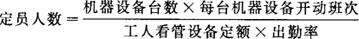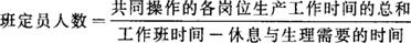 根据企业已定的产品方向和生产规模,在一定时期内和一定的技术组织条件下,规定的企业各类人员的数量界限。 其计算公式如下: (1)按劳动效率定员  式中:N为定员人数;Q为生产任务,可用工时或产量表示;β为工人劳动效率,β=劳动定额×定额完成率;d为出勤率;n为每日工作班次数。 由此公式可推出按工时定额计算的定员人数:  (2)按设备定员  这个公式主要适用于以机械操作为主的工种,特别是有较多同类型机器设备,采用多机床管理的劳动组织中。 (3)按设备岗位定员 主要根据设备岗位多少计算定员。对于多岗位共同操作的设备,定员人数按以下公式计算:  式中,生产工作时间指作业时间、布置工作地时间和准备与结束时间之和。 |