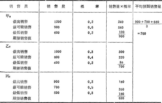 释义 | 定性预测 1.个人判断法 这是由企业决策人根据客观情况的分析和经验,对市场需求的情况作出主观判断,预测未来的情况。这种方法在缺乏预测资料时尤其适用。如果企业决策者有较丰富的经验和分析判断能力,并且对各方面的情况比较熟悉,可以得到较好的预测结果。这种方法迅速简便,而且市场一旦发生变化,随时可以调整和修改。其缺点是客观性较差,容易偏重于主观意志,有可能发生判断错误。 2.综合判断法 预测者根据企业各有关部门负责人或销售人员的意见,预测产品的销售量,然后,将不同人员的预测值进行综合,得出预测结果。如表8-2所示,就是三个销售员的预测值。 表8-2 另外,正经理的预测期望销售值为1000;付经理的预测期望销售值为900;则经理的平均销售预测值为950。若经理预测的重要程度比销售员大一倍,则综合经理与销售员两方面的销售预测值为: 3.德尔菲法(专家意见法) 由美国兰德公司在50年代初创造的一种预测方法。就是让各种专家在没有争议和没有外来影响的条件下,充分发表自己的意见。具体做法见“方法篇”(三) |