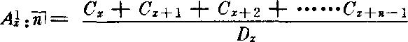 寿险计算方法,其公式(保额为1元)  将其分子和分母同乘以Vx则  设:Cx=Vx+1dx,Cx+1=Vx+2dx+1……; D=Vxlx。 则:  如再设Mx=Cx+Cx+1+Cx+2+……  其中A : 代表定期死亡保险保险金额一元的趸缴纯保险费,x代表被保险人投保时的年龄,n代表保险期限,x上面的阿拉伯数字“1”表示定期死亡保险。上述算式中,V为贴现因子(1+i)-1,dx为死亡表中x岁至x+1岁之间一年内死亡的人数,lx为死亡表中生存至x岁的人数。Cx、Dx、Mx常称为寿险精算换算符号。 |
