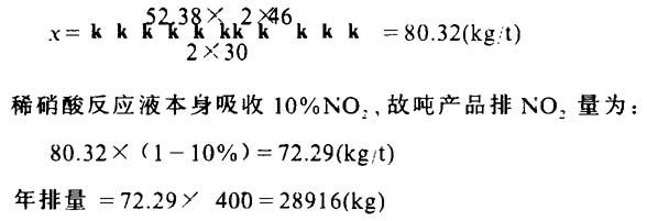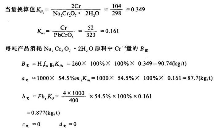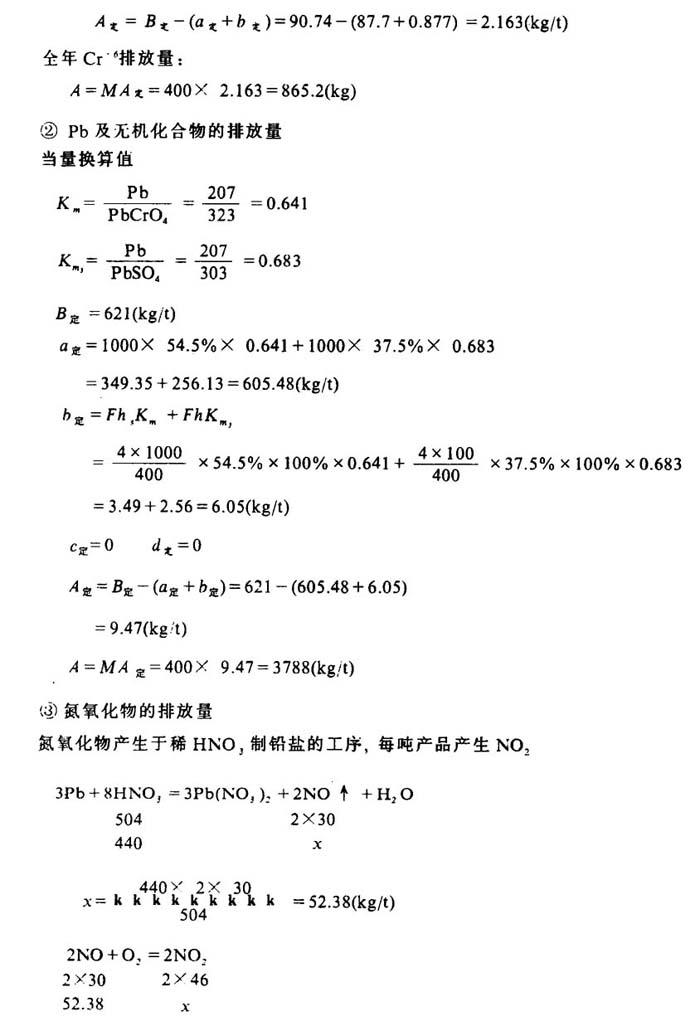 C定=Lγ,KL (6-1-9) L——分解转化掉的含污染物的单位产品数量(kg/t) γs——分解物与污染物有关的主要成分的纯度(%) KL——当量换算值 d定——单位产品净化处理掉的污染物量(kg/t或标m3/t) Ca——处理前某污染物浓度(kg/t或kg/标m3) Cc——处理后某污染物浓度(kg/t或kg/标m3) Q——报告期内废弃物处理量(t或kg或m3) [例]某化工厂年产400t柠檬黄,每年从废水中收4t产品,生产中排放的主要污染物有Cr+6及其化合物、Pb及化合物、氮氧化物。已知单位产品消耗的原料量为Pb621 kg/t,Na2Cr2O3·2H2O260 kg/t,HNO3440 kg/t,产品的化学成分为PbCrO454.5%,PbSO437.5%,A1(OH)38%,求该厂各种污染物年排量。 解:该厂产生的污染物主要有Cr+6、Pb(铅)及其无机化合物、氮氧化物。 ❶ 计算Cr+6年排放量 |