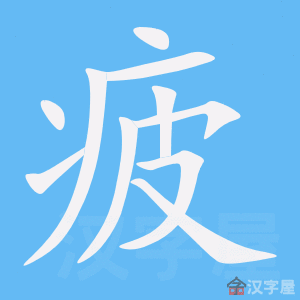 字源解说 皮,既是声旁也是形旁,表示表面。疲,篆文 = (疒,病)+ (皮,表面),表示病在表皮。造字本义:形容词,表面的病态,即困乏、倦怠,稍加休息即可。隶书 将篆文的“疒” 写成 ,将篆文的“皮” 写成 。 附 文言版《説文解字》:疲,勞也。从疒,皮聲。 附 白话版《说文解字》:疲,身体劳顿。字形采用“疒”作边旁,采用“皮”作声旁。