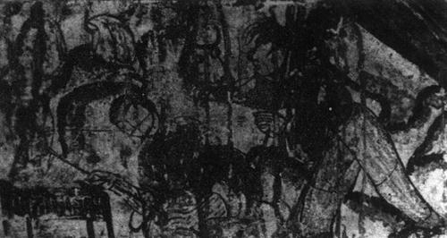 释义 | 宴饮图 【作品赏析】: 1957年在洛阳老城附近发掘了一座重要的西汉壁画墓,墓内以空心砖构成墓门和长方形的主室,另有耳室和副耳室。 时代约当西汉元帝一成帝之间(前48-前47)。壁画画在墓顶门额、隔墙和后壁上,绘有日月星象和神话、历史故事等。此图画在主室后壁上方,画面共绘八人:正中有二人踞坐,手持角杯(觥),正面有一獠牙外露、眼如铜铃的长毛怪兽,也手持角杯。 其左右各有三人侍立,左侧 人持剑挥舞。画面右侧二人在火炉前烤肉,背后挂钩上悬挂著牛肉、牛头。郭沫若先生曾作过考释,认为此壁画应为历史故实《鸿门宴》。 这一解释至今尚未得到研究者的公认。卜千秋墓壁画的发现,便有可能经过比较研究来确定这幅作品的内容。 它或许就是傩仪图,即打鬼图。 古代迷信“人死升仙”,故特重打鬼仪式。据《周礼》记载:打鬼的头目“方相氏掌蒙熊皮,黄金四目,玄衣朱裳,执戈扬盾,帅百隶而时傩,以索室欧(驱)疫。”天子入葬时,也在圹四隅驱打。 打鬼的方相氏不但见于卜千秋壁画,最早的也见于战国曾侯乙墓漆棺绘画中。此图似是打鬼前的准备场面,正中踞坐持觥者正是头戴假面、全身披挂、扮作怪熊的方相氏。画幅庄重而气魄雄大,用笔流畅,与卜千秋墓壁画堪称姐妹作。而这幅画则更重人物表情的刻画,画中人物神采飞动,极尽传神之趣。 西汉壁画发现虽不多,但从长沙马王堆帛画、临沂金雀山九号墓帛画以及洛阳八里台、卜千秋、老城壁画墓等作品中,可以了解到西汉绘画表现人物技巧的发展,对传神、用笔方面的追求,以及整体上气魄的深沉雄大。此画背景山峦起伏,以环带状画法表现,也是今天研究早期山水面法不可多得的绘画实物。 。 汉 壁画 河南洛阳汉墓 纵23厘米 横193厘米 墓室复原迁建于洛阳王城公园 |