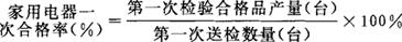 释义 | 家用电器一次合格率 指家用电器第一次检验合格品产量与第一次送检数量的比值,用百分比表示。 反映家用电器产品质量的指标。其计算公式为: 家用电器主要指家用洗衣机、电冰箱、电风扇、单相空调器等产品。按照规定还应分别计算它们的一次合格率。 |
