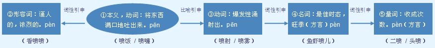 猛地散着射出。 a.常作带宾、带补谓语。 ~水|~油漆|~药|~石灰|重机枪哒哒哒地响着,~出一条条的火蛇|他打开淋浴器,阵阵热水从莲蓬头里~出来|他咆哮着,不堪入耳的污言秽语都从嘴巴里~了出来。 b.作定语,或构成词组作定语。 ~的漆太多了|~水的龙头坏了。 【词语】 喷薄 喷饭 喷气式飞机 喷泉 喷洒 喷水池 喷嚏 喷头 喷吐 【注意】 又读pèn,如:喷香(香气浓厚)。