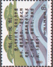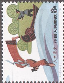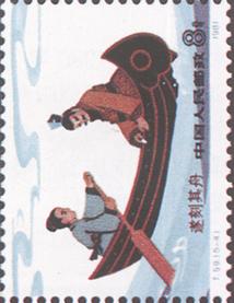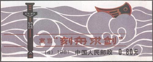 释义 | 寓言:刻舟求剑 发行日期:1981年3月10日 齿孔度数: 印刷版别:影写版 票幅:40×30 全张枚数:50(5×10) 设计者:潘可明 印刷:北京邮票厂 (1)8分 刻舟求剑 1000万枚 (2)8分 楚人涉江 1000万枚 (3)8分 剑坠于水 1000万枚 (4)8分 遂刻其舟 1000万枚 (5)8分 入水求之 1000万枚 (1)-(5) 5枚全 注:5种图案连印成5连张。 SB(4)1981 刻舟求剑(小本票) 发行日期:1981年3月10日 小本票规格:145×60 邮票面值及枚数:8分×(5×2)=0.80元 设计者:潘可明 印量:50万本 |