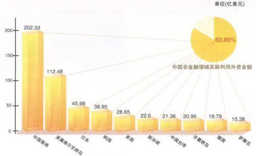 对中国大陆实际投资金额前十位的国家和地区 截至2006年底,全国累计批准设立外商投资企业59万多家,实际使用外资金额超过7000亿美元。 随著中国利用外资环境日益改善,对外资的吸引力不断增强,根据联合国贸发会议的调查报告,中国已超过美国,成为跨国公司研发中心布局的首选地。 东部和西部地区外商投资增长较快,地区分布仍不平衡。外商直接投资的行业中,投资增长幅度最快的行业是批发和零售业。 其次是房地产业。 |