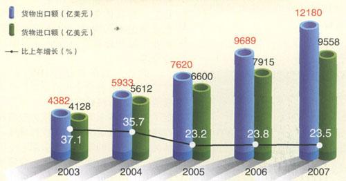 释义 | 对外贸易概况 中国正按照市场经济的要求履行作为世贸组织成员所承担的义务,形成稳定、透明的涉外经济管理体制,创造公平和可预见的法制环境。 修订后的《中华人民共和国对外贸易法》于2004年7月1日实施,这部法律是中国对外经济贸易的基本法律,是建立中国涉外经济贸易管理体制的法律基础,也是建立中国对外经济合作管理制度和政府在经贸领域实行依法行政的基础。在此基础上,还将建立一系列配套办法、措施和规则。 2003~2007年货物进出口总额及其增长速度 |