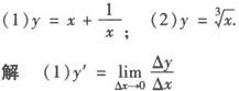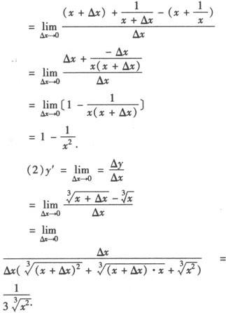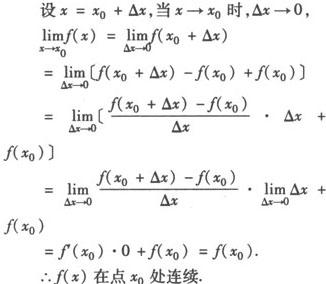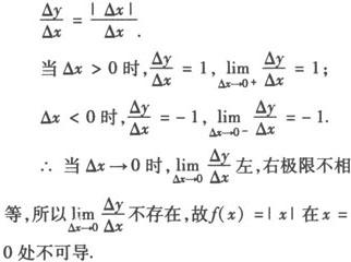 曲线y=f(x)上任一点(x,y)的切线的斜率是f(x)在x处的导数,即 ,也就是说,曲线y=f(x)在点P(x0,f(x0))处的切线的斜率是f′(x0),相应地,切线方程为 y—y0=f(x0)(x—x0). 例1 利用导数的定义,求下列函数的导数.   例2 证明 若函数f(x)在点x0处可导,则f(x)在点x0连续. 证明 要证f(x)在点x0处连续,即证 于是只要证: f(x0)〕=0,而利用函数f(x)在点x0处可导可以证明这一点.  其逆命题:“若函数f(x)在点x0处连续,则它在点x0处可导”是否成立呢?回答是否定的,如函数y=|x|在点x=0处连续,但在点x=0处不可导,请读者自己给出证明. 例3 求证y=|x|在点x=0处连续,但在点x=0处不可导. 证明 只需证 不存在即可证明在x=0处不可导.  ∴f(x)=|x|在点x=0连续.△y=f(0+△x)—f(0)=|△x|,  |