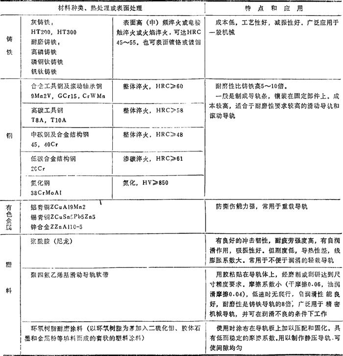 释义 | 导轨及其常用材料的种类和特点 按摩擦性质,导轨的分类及其特点见表4.20-1,导轨的主要材料及其特点和应用见表4.20-2。 表4.20-1 导轨的种类和特点 注:动导轨和支承导轨常用不同材料或同-材料不同热处理硬度进行搭配,以提高耐磨性。 |