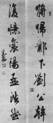 【简介】: 现代·邓散木书。纸本。行书。共十六字,刊于《中国书法》一九八八年第二期。 【赏析】: 散木性情豪爽、豁达,有“畸人畸行作畸书”之说,是我国现代著名金石书法家。 这幅行书七言联,係他中期所作,窥其渊源,以二王爲宗,集张旭、怀素之长,融王铎、黄幼度笔意,奔放之中,又富含蓄。结体严谨,气势开张,中宫紧收,墨色圆润。布局随心所欲,得心应手;整体韵律生动,超妙入神。有如雅士端坐,平和之气溢于字行间。 散木一生自励,治学谨严,著述丰富。早年从师萧退庵,崇尙吴昌硕,能摆脱前人窠臼,独闢蹊径,另有面目,他的书法神完气足,力透纸背,能四体书,各臻妙境。