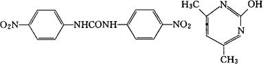 | 释义 | 尼卡巴星 C19H18N6O6=426.39 CAS-330-95-0 1,3-双(4-硝基苯)脲-4,6-二甲基嘧啶-2-醇。 1,3-bis(4-Nitrophenyl)urea-4,6-dimethylpyrimidin2-ol. 4,4′-二硝基-碳酰苯胺与-4,6-二甲基-2-嘧啶醇的化合物(1∶1)。 4,4′-Dinitro-carbanilide compd with 4,6-dimethyl2-pyrimidinol(1∶1). 抗球虫病药。 Nicarbazin,Nicarb,Nicoxin,Nicrazin. BAN,USAN,MI.