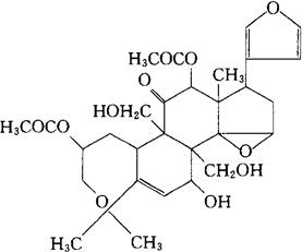 C30H38O11=574.60 24-去甲胆甾-20,22-二烯-4-羧乙醛,3,12-双(乙酰氧基)-14,15∶21,23-双环氧-17,19-三羟-4,8-二甲基-11-氧代-,环-4,19-半缩醛,[1α,3α,4β,(R),5α,7α,12α,13α,14β,15β,17α]。 24-Norchola-20,22-diene-4-carboxaldehyde,3,12-bis(acetyloxy)-14,15∶21,23-diepoxy-17,19-trihydroxy-4,8-dimethyl-11-oxo-,cyclic-4,19-hemiacetal,[1α,3α,4β(R),5α,7α,12α,13α,14β,15β,17α]. 抗寄生虫药。用于除蛔虫,对蛲虫和鞭虫也有效果。苦楝素。 Toosendain,Chuanliansu,Azedarachin. 川楝素片。  |