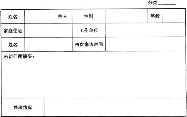1.(工会机关名称)人民来信登记簿 ____信访办公室 年 月 日 7.群众来访登记卡 年 月 日 接待员: 8.群众来访卡片 接待员: 年 月 日 |
