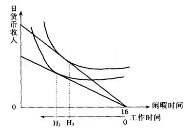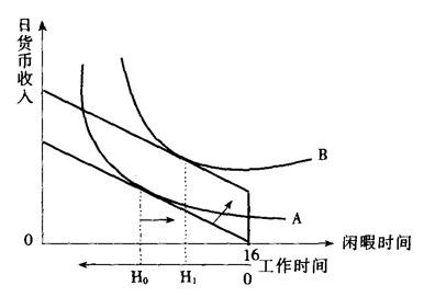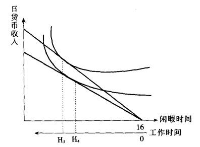 工作决策理论认为,如果收入增加,工资率不变,个人将增加闲暇时间,减少工作时间;反之,如果收入减少,工资率不变,个人将减少闲暇时间,增加工作时间,收入变化对个人劳动力供给的这种影响称为收入效应。 如果工资率增加,收入不变,个人将减少闲暇时间,增加工作时间;反之,如果工资率减少,收入不变,个人将增加闲暇时间,减少工作时间,工资率对个人劳动力供给的这种影响称为替代效应。若用图形表示,非劳动收入的增加(减少),引发收入效应,预算约束线将向右(左)平移,如图1所示,工作时间由H0降为H1。 工资率增加(减少)一般会同时引起收入的增加(减少),同时引发收入效应与替代效应,预算约束线将向上(下)移动,如果收入效应大于替代效应,工作时间将减少,如图2所示,从H2降为H3,如果收入效应小于替代效应,工作时间将增加,如图3所示,从H4增加为H6。  图1  图2  图3 |