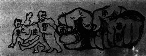 释义 | 工学商打倒曹、陆、章 【作品赏析】: 此画产生于1919年“五四”运动中。 画中描绘三个巨大而有力的拳头,上写“劳动”、“学”、“商”字样,正打向当时全国人民一致要求惩办的卖国贼曹汝霖(交通总长)、陆宗舆(币制总裁)和章宗祥(驻日公使)。三个拳头象征“五四”爱国运动中由工人罢工、学生罢课、商人罢市所构成的群众爱国运动的巨大力量。只要把这幅画放到“五四”运动这样特定的社会政治背景之下来考察,就会发现作品概括而准确地反映了这场伟大的革命运动。用拳头象征人民的力量,在当时的漫画创作上是一件非常值得引起注意和重视的事情,因为在此之前,如清末民初的漫画中,民众的形象大都是软弱无力、任人宰割的。 相比之下,这幅画中的人民则象巨大有力的拳头出现于画面;在构图上,人民的力量对卖国贼来说完全处于压倒的地位。尤其是其中写有“劳动”字样的象征工人罢工的拳头,表明进入新民主主义革命后中国工人阶级的力量在漫画创作中得到了最初的体现,有著重大而深刻的意义。 。【作者介绍】:沈泊尘(1889-1920),原名沈学明。 从小酷爱绘画。二十岁后开始为上海各报刊画讽刺漫画。 同时画中国画、油画、水彩画和戏剧人物画。1917年代表上海《新申报》参加赴日记者团东渡日本考察新闻事业现状及近代绘画。 1918年在上海创办了我国漫画史上第一个专门的漫画刊物《上海泼克》(共出四期)。1919年“五四”运动中他还创作过另外一些及时反映这场伟大革命运动的漫画。 他是“五四”时期具有代表性的漫画家。 。