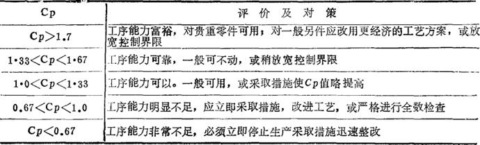 工序能力是指工序处于稳定状态下能够保证产品质量的能力。可以用产品的实际尺寸分布B=6σ来表示(σ为标准偏差。 工序能力指数又叫工程能力指数Cp,是指工序能力能够满足质量要求的程度。可以用公差范围的数值T与工序能力的比值来表示,当公差中心与尺寸分布中心重合时:CP=T/B=T/6σ;当分布中心与公差中心偏移ε值时: C′p=K·CP=(1-#)Cp =(1-#)#,(参见图10-14)。 工序能力指数是衡量工序能力的综合指标。实践中,常通过对CP值的测算,评价工序能力的大小,判断工序满足质量要求的程度,并决定采取相应的对策(参见表10-2)。 表10-2 工序能力评价