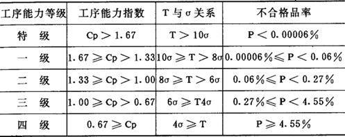 根据上述公式,五个工序能力等级所对应的产品不合格品率见下表: