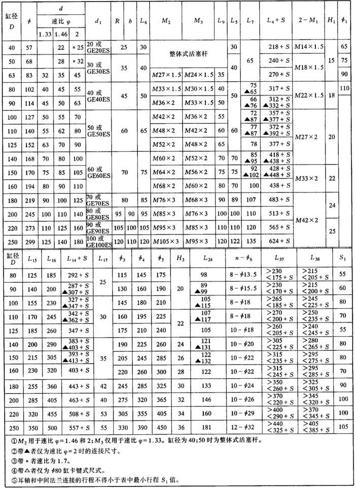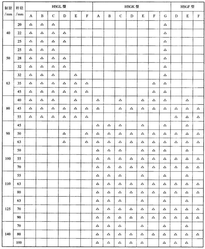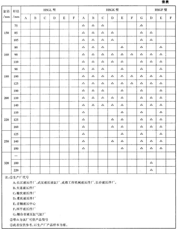 HSG型工程用液压缸为双作用单活塞杆式液压缸。具有安装连接方式多样以及可带缓冲装置等特点。适用于工程机械、起重运输机械、船舶机械、冶金矿山机械以及其它液压系统。 (1)型号说明 (a)HSGL型(前端盖为外螺纹连接);(b)HSGK型(前端盖为内卡环连接);(c)HSGF型(前端盖为法兰连接) (4)外形安装连接尺寸 A.活塞杆端为外螺纹连接 外型及安装尺寸见图23.4-2和表23.4-17。 表23.4-17 活塞杆端为外螺纹外形安装尺寸表(见图23.4-2) 单位:mm 表23.4-18 活塞杆端为外螺纹带单耳环外形安装尺寸表(见图23.4-3) 单位:mm 表23.4-19 活塞杆端为内螺纹外形安装尺寸表(见图23.4-4) 单位:mm 表23.4-20 活塞杆端为内螺纹带单耳环外形安装尺寸表(见图23.4-5) 单位:mm  (5)生产厂 HSG型工程用液压缸主要生产厂:长江液压件厂、武汉液压油缸厂、成都工程机械液压件厂、长沙液压件厂、大连液压件厂、榆次液压件厂、重庆液压件厂、四平液压件厂、烟台市液压缸气缸厂、首钢液压中心。 上列各生产厂可供产品型号明细见表23.4-21。 表23.4-21 HSG型工程用液压缸产品明细表   |