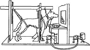 巴甫洛夫以狗为实验对象来建立铃声引起唾液分泌的经典条件作用实验。 一般实验装置(如图):用一副套具把狗固定于隔音室食物台前的位置上,用一导管从狗的唾液腺口收集唾液,并将该导管与记录唾液分泌总量和分泌滴数的装置相连。实验开始时,先呈现铃声,狗并未分泌唾液,此时铃声仅是中性刺激。之后,让铃声先于食物数秒钟出现。这样将铃声与食物多次配对后,当只给铃声而无食物时,也引起狗分泌唾液。中性刺激铃声因与食物的多次配对而成为食物的信号,即条件刺激,从而引起狗分泌唾液这一条件反应。巴甫洛夫将铃声与唾液分泌之间联系的建立称为条件反射。 在这类实验基础上,他提出条件反射学说,并以条件反射为指标,探讨了高级神经活动规律,提出两种信号系统学说、高级神经活动类型学说等。