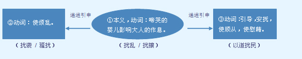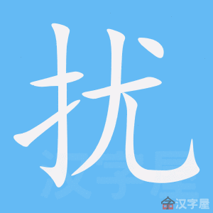 字源解说 扰,金文 = (像一个人用手捧着)+ (包裹,代表包着婴儿的襁褓),表示对婴儿的哭闹无奈,心烦。有的金文 = (像一个人托举两手)+ (包着婴儿的襁褓)+ (脚,走动),表示一个人双手抱着在襁褓里哭泣的婴儿,四处走动,哄着婴儿。造字本义:啼哭的婴儿影响大人的作息。篆文 = (手,抱)+ (页,烦恼)+ (止)+ (止,走动)+ (了,婴儿),强调婴儿带来的干扰:因为婴儿啼哭,大人不得不在半夜里起床抱着孩子走动。隶书 将篆文的“手” 简写成 ,失去五指形象。俗体楷书 用同音字“尤”代替“憂”。 附 文言版《説文解字》: ,煩也。从手, 聲。 附 白话版《说文解字》:扰,令人烦。字形采用“手”作边旁,采用“ ”作声旁。 引申线索