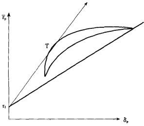 在资本资产定价模型中,当市场进入均衡状态,每一种证券在引入无风险借贷后的有效集切点组合T的构成中具有一个非零的比例。 如图,分别以证券组合的预期收益率rp和测度风险的标准差δp为纵坐标和横坐标,T点是从无风险利率rf出发所引射线与不包括无风险借贷的有效集的切点。首先,每一个投资者对每一种风险证券都将愿意持有一定的数量。其次,市场上每种证券的现有价格将处在使得对于股票需求与供给相等的水平上。 再次,无风险利率的水平正好使得借入资金的总量等于贷出资金的总量。结果,在均衡时,切点组合T的比例与市场证券组合的比例相对应。所谓市场证券组合,是由所有证券构成的组合,在这个组合中,投资于每一种证券的比例等于该证券的相对市值。 一种证券的相对市值简单地等于这种证券总市值除以所有证券的市值总和。习惯上,将切点组合叫做市场组合,并且用M而不是用T表示。  引入无风险借贷后的有效集 |