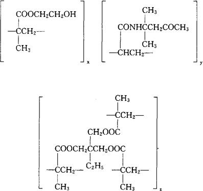 (C6H10O3)x(C9H15NO2)y(C18H26O6)z CAS-56030-52-5 2-甲基-2-丙烯酸,2-羟乙基酯与N-(1,1-二甲基-3-氧丁基)-2-丙烯胺和2-乙基-2-[[2-甲基-1-氧-2-丙烯基)氧]甲基]-1,3-丙二基双(2-甲基-2-丙烯酸盐的聚合物。 2-Methyl-2-propenoic acid,2-hydroxyethylester,poly met with N-(1,1-dimethyl-3-oxobutyl)-2-propenamide and 2-ethyl-2-[[2-methyl-1-oxo-2-propenyl)oxy]methyl]-1,3-propanediyl bis(2-methyl-2-propenoate). 2-羟基乙基异丁烯酸与N-(1,1-二甲基-3-氧丁基)丙烯酰胺和2-乙基-2-(羟基甲基)-1,3-丙二醇三异丁烯酸的共聚物。 2-Hydroxyethyl methacrylate polymer with N-(1,1-dimethyl-3-oxobutyl)acrylamide and 2-ethyl-2-(hydroxymethyl)-l,3-propanediol trimethacrylate. 隐形眼镜材料。 Bufilcon A,80016. USAN.  |