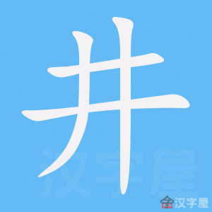 字源解说 井,甲骨文 像两纵两横构成的方形框架。造字本义:人工开凿的提取地下水、有方形护栏的水坑。金文 承续甲骨文字形。有的金文 在方形框架 中加一点指事符号,表示坑中有水。篆文 承续金文字形 。隶书 省去一点指事符号。 附 文言版《説文解字》:井,八家一井。象溝韓形罋之象也。古者伯益初作井。凡井之屬皆從井。 附 白话版《说文解字》:井,古制八家共汲一井。“井”字像木头纵横构架的形状,像汲瓶的样子。据说古昔时代一个叫伯益的人最早发明了水井。所有与井相关的字,都采用“井”作边旁。 引申线索