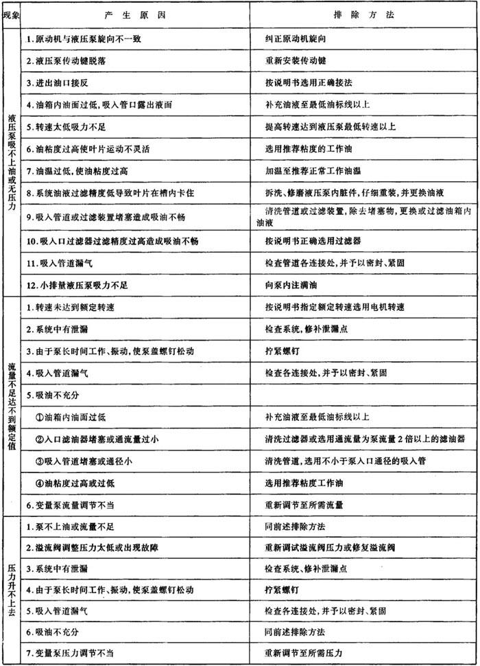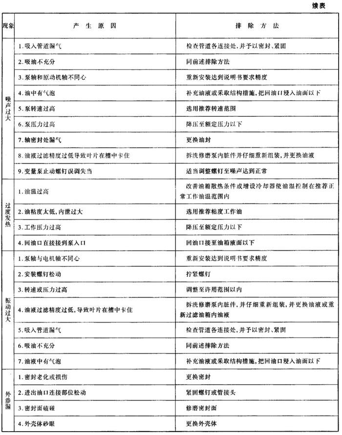 释义 | 常见故障及排除方法 用户在使用中,如发现异常现象,请参照表9.7-1查找原因,并予以排除。如仍不能解决问题,请不要盲目拆修泵,应及时与生产厂取得联系,以免处理不当造成损失。 表9.7-1 叶片泵常见故障及排除方法 |