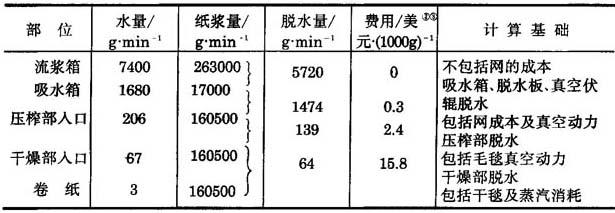 注:❶ 表中数据为新闻纸机、抄速600m/min时,各部脱水量与费用概算。
