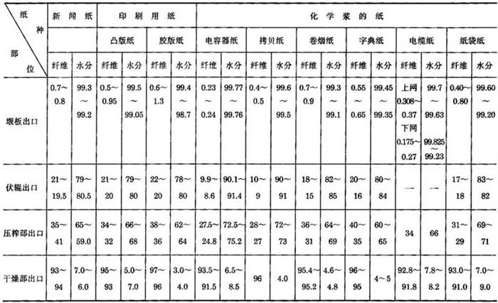表11-5-2 纸机各阶段的水分与纤维的质量分数(%)
