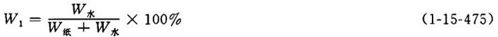 【说明】 根据工艺方面的要求,纸幅在离开压榨部时的水分含量一般在63~67%左右。就是说进入干燥部每1kg湿纸幅中含有0.63~0.67kg的水分和0.33~0.37kg的干纸。这是以湿纸为基准(简称湿基)表示纸页中水分含量的方法,用W表示;另外还有一种以绝干纸为基准(简称干基)表示水分含量的方法,以C表示。在干燥过程中被蒸发的水分重量可由下式求得。 【公式】  式中 W——被蒸发的水分重量(kg/h) G1——进入干燥部的湿纸重量(kg/h) G2——出干燥部的湿纸重量(kg/h)  W1——干燥前纸中的水分含量,即湿基(%)  W水——干燥前纸页中水分重量(kg/h) W纸——干燥前纸页中绝干纸重(kg/h) W2——干燥后纸中的水分含量,即湿基(%),计算同W |