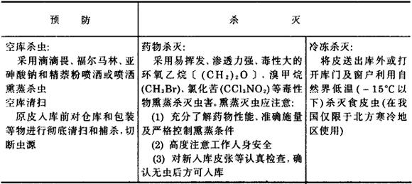 释义 | 干皮的防虫 原皮仓库常见的食皮虫有蛸翅类(甲虫),鳞翅类(蛾类)和双翅类。其中甲虫主要有三种,即普通食脂皮虫,弗里什皮虫和腐肉皮虫见图1-35。 干皮的防虫分成预防和杀灭,见表1-80。 表1-80 干皮的防虫 严格执行仓库管理制度,预防与杀灭相结合是原料皮安全保藏的保证。 |