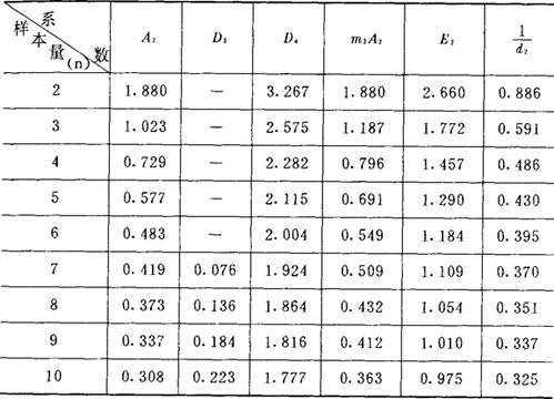 式中:CL表示中心线;UCL表示控制上限;LCL表示控制下限; R控制图控制界限和中心线的计算公式为: 式中:R1表示第i号子样的极差值;D4、D3表示由子样大小n确定的系数,可由控制图用系数表查得。 附:控制图用系数表。 控制图用系数表 |