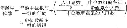 指一定人口总体年龄序列的中间值。 它将总人口分为两半,一半人口在年龄中位数以上,一半人口在年龄中位数以下。如果有间隔一岁为一组的分年龄的人口数资料,计算年龄中位数的方法是:先将人口总数除以2求人口中位数所在组,然后从0岁组起逐步按年龄组累计人口数,当累计人口数达到人口中位数所在的年龄组时,这个人口中位数所在的年龄组,就是年龄中位数组;然后再计算年龄中位数。计算公式为:  年龄中位数反映人口总体的年龄特征。年龄中位数上移,意味著人口向老龄化方向发展;年龄中位数下移,意味著人口向年轻化方向发展。 一般按下列标准划分人口年龄构成类型: 年轻人口型:年龄中位数在20岁以下; 成年人口型:年龄中位数在20岁-30岁之间; 老年人口型:年龄中位数在30岁以上。 |
