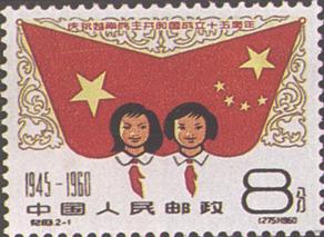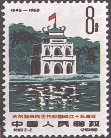 释义 | 庆祝越南民主共和国成立十五周年 发行日期:1960年9月2日 印刷版别:影写版 齿孔度数:(1) 图幅:(1)36×25.5;(2)26×35.5 全张枚数:(1)50(5×10);(2)50(10×5) 设计者:刘硕仁 印刷:北京邮票厂 (1)8分 中越友好 540万枚 (2)8分 还剑湖 540万枚 (1)-(2) 2枚全 |