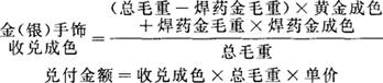 释义 | 废旧金笔尖、金银手饰收兑 银行收兑废旧金笔尖、金银手饰时计算成色和兑付金额可使用如下公式: (1)废旧金笔尖按成色收兑。笔尖上打有14K或58.3%字样的,按57%成色收兑;笔尖上打有12K或50%或五成金字样的,按48%成色收兑。 兑付金额=毛重×成色×单价 (2)金银手饰收兑: |