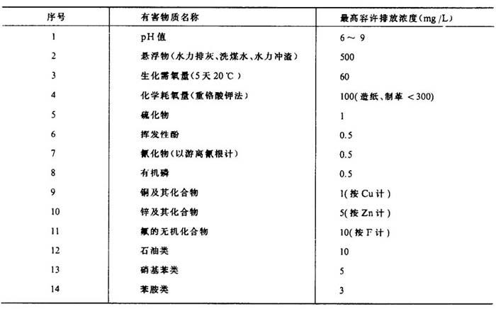 [说明]工业废水中有害物质最高容许排放浓度分为两类:第一类是能在环境或动植物体内蓄积,对人体健康产生长远影响的有害物质。含此类有害物质的废水,在车间或车间处理设备排出口,应符合表6-3-1规定的标准,但不得用稀释的方法代替必要的处理。第二类,其长远影响小于第一类有害物质,在工厂排出口的水质应符合表6-3-2的规定。