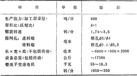 目前国内有下列三种型式 1.立式单螺旋压榨机(图7-5) 是长期来较为普遍采用的一种,它的生产能力较低,一些糖厂作了如下改进,取得提高生产能力的效果:(1)顶部加盖强制进料,(2)喂料口及锥底增长螺旋叶,延长挤压过程,消除死角,(3)位于螺旋叶间的圆形喷汽嘴改成具有角度的扁形嘴,除提温外还起导桨的作用,或同时另增设导桨,(4)适当增大转速。生产能力目前已有提至日处理废粕量600吨以上。 立式单螺旋压榨机规格见表7-14。 表7-14 立式单螺旋压榨机规格 其结构同立式相似,但转速较高,废粕通过时间较短,生产能力大,脱水少,适用于压出的废粕直接作为饲料。 卧式单螺旋压榨机规格见表7-15。 表7-15 卧式单螺旋压榨机规格 它适用于压粕再行干燥,以尽力降低煤耗。这种根据双螺旋原理设计的特点为:开始压榨时压力突增,然后缓慢地增加,不仅提高压榨效果而且可缩短时间,这可由图7-8的压榨机容积曲线中看到。 (a)容积曲线 (b)压榨螺旋断面 卧式双螺旋压榨机的规格见表7-16。 表7-16 卧式双螺旋废粕压榨机规格  压榨机前后物料流槽坡度(对水平面)应大于60°。 废粕压榨机生产能力可按下式近似求得:  式中 A——加工甜菜量(吨/日) V——进料处一螺旋内的有效容积(米3) γ——废粕容重(吨/米3) φ——充填系数,取0.9~0.95 n——转数(转/分) λ——打滑系数,由实验测得可取0.85~0.90 a——废粕对甜菜重的% |