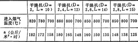 释义 | 废粕干燥机的干燥容积强度 干燥容积强度(a)同进入干燥机的烟气温度及干燥机尺寸有关,表7-18所列的关系可供参考。 表7-18 废粕干燥机的干燥容积强度 注:D及L分别为转筒直径及长度(米) |