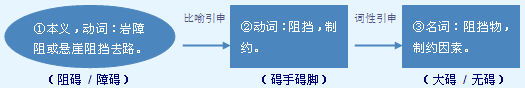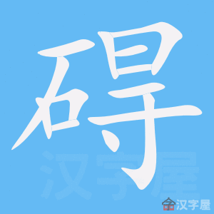 字源解说 碍,篆文 = (石崖)+ (疑,在路上不知所向),表示阻挡行进的岩障。造字本义:岩障或悬崖阻挡去路。楷书俗体字形 = (石崖)+ (“得”的本字,表示远行拾贝),突出路障对于远行探索的干扰。 附 文言版《説文解字》:礙,止也。从石疑聲。 附 白话版《说文解字》:碍,(在巨岩前面)因疑惑而止步。字形采用“石”作边旁,“疑”是声旁。 引申线索
