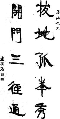 清康有为书。纸本。楷书。书‘拔地孤峰秀,开门三径通’五字联。此帖书法用笔平放自然,气势开张通达,书风老到沉稳。