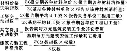 释义 | 建筑安装工程价格指数 指固定资产投资中建筑安装工程价格变动的指数。 它是材料费、工资和其它费用三种分类指数的加权平均指数。其计算公式如下: 式中,权数是指建筑材料价值、工资总额和其它费用总额各占建筑安装工作量的比重。 |