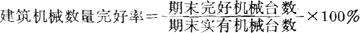 释义 | 建筑机械数量完好率 指一定时期末建筑机械完好台数与期末实有机械台数之比。 用百分数表示。反映机械管理、技术管理和机械保修工作水平的综合指标。 计算公式为: 按台数计算完好率可以反映施工单位在一定时期末机械设备的完好状况,可作为安排下期机械设备使用及维修保养工作的依据。 |